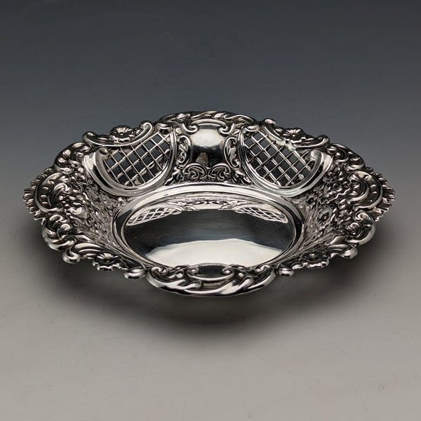英国アンティークの純銀製のディッシュをご紹介します。こちらは1897年 英国チェスターGeorge Nathan & Ridley Hayesの作品となります。小花などの植物をモチーフとしたピアスとエンボスによる細密な装飾がとても美しいです。4本の丸い脚でぐらつきなくしっかりと固定されています。この素敵なアンティークシルバーがあなたの毎日に彩りを与えてくれることを願っています!【コンディション】外観:★★★★☆ 目立った傷や汚れのない美品機能:★★★★☆ わずかな劣化はあるがほとんど問題ない・経年の摩耗はありますが目立つ傷や凹みはなくとても美しい状態です。・純銀を保証するホールマークがしっかりと残っています。・グラつきなどはありません。 ※とても古いものですので経年による細かな傷や汚れはございます。 ※写真をご確認いただきご了承いただいたうえで購入をお願い致します。【詳細】・メーカー George Nathan & Ridley Hayes・製造年 1897年(チェスターO)・材質 スターリングシルバー(925/1000)・サイズ 幅158 x 奥110 x 高さ31 mm・重量 62g※アンティーク品ですので全く同じものは他にありません 不明な点がありましたらなんでもお気軽にご質問ください。