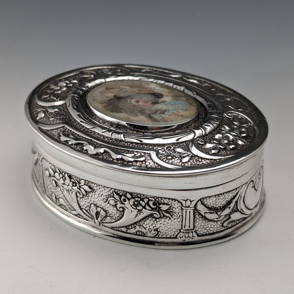 アンティークの純銀製のボックスをご紹介します。こちらはドイツ コンチネンタルシルバー製のオーバル型ボックスです。全体に小花がデザインされた美しい浮き彫り彫刻が施されています。蓋には少女の絵がはめ込まれています。あなたの宝物を入れておくケースとしていかがでしょうか?この素敵なボックスがあなたの毎日に彩りを与えてくれることを願っています!【コンディション】外観:★★★☆☆ やや傷や汚れあり機能:★★★★☆ わずかな劣化はあるがほとんど問題ない・経年の摩耗や汚れはありますが、よく手入れされており美しい状態です。・蓋中央の少女の絵は汚れがあります。・内部の金メッキはかなり薄くなっています。・底部分に「800」とドイツのホールマークと思われる王冠の刻印があります。・蓋の開閉はスムーズでピッタリと閉まります。 とても古いものですので経年による細かな傷や汚れはございます。 写真をご確認いただきご了承いただいたうえで購入をお願い致します。【詳細】・メーカー 不明(ドイツ製)・製造年 1900年頃・材質 コンチネンタルシルバー(800/1000)・サイズ 外寸 高31 x 幅76 x 奥59 mm 内寸 高25 x 幅72 x 奥53 mm・重量 85g※アンティーク品ですので全く同じものは他にありません 不明な点がありましたらなんでもお気軽にご質問ください。