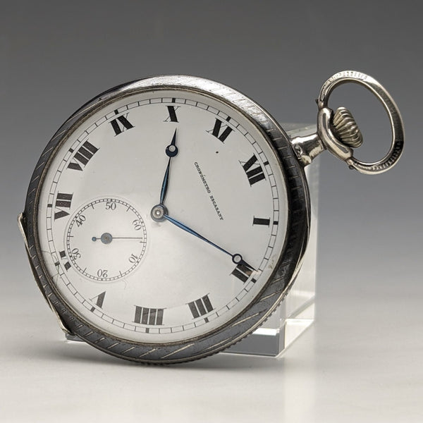 スイス製のアンティーク懐中時計を紹介いたします。こちらはブエノス・アイレスのジュエラーである「Casa Escasany」で販売された時計のようです。銀のケースに黒い合金素材を象嵌したニエロケースと呼ばれるとても手間のかかるものです。ストライプのニエロ象嵌にゴールドのカルトゥーシュがワンポイントとなっています。薄型で大きさの割に軽く、取り扱いやすい時計です。オーバーホール歴は不明ですがテンプの振りも良好でカチカチと元気に動いています。 この素敵なアンティークウォッチがあなたの毎日に彩りを与えてくれることを願っています! (説明動画)https://youtu.be/lFysrWA5O6A?si=GFsUjr2HnBmbfODK 【コンディション】外観:★★★★☆ 目立った傷や汚れのない美品機能:★★★★☆ 整備履歴は不明だが良好な動作状態(日差5分以内)・ケース:経年の摩耗はありますが黒金の欠けもほとんどなく美しい状態です。・ケース刻印:裏蓋内部などにスイスの900シルバーの刻印があります。・文字盤:6時付近と中心付近に小さな欠けがありますがほとんど目立ちません。・その他:風防はミネラルガラス製です。・精度:平置きタイムグラファー計測で日差 1分程度・パワーリザーブ:フルゼンマイから 33時間まで確認  ※日差は姿勢差などでも変わりますので参考程度でお考えください  ※とても古いものなのでパーツ交換や修理の履歴はわかりません【詳細】・ブランド Escasany・製造年 1920年頃・ムーブメント 機械式・ゼンマイ 手巻き・時刻合わせ リューズ引き(ペンダントセット)・シリアルNo.7017150・ケース材質 コインシルバー(900/1000)ニエロ象嵌・ケース直径 50mm(竜頭除く)・ケース厚さ 11mm(風防含む)・重量 66g※アンティーク品ですので全く同じものは他にありません 不明な点がありましたらなんでもお気軽にご質問ください。