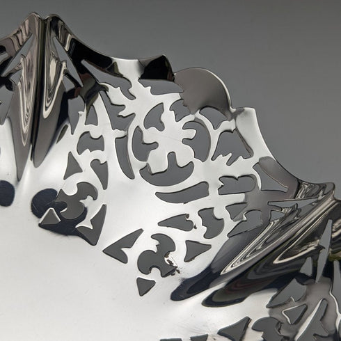 背の低い脚のついたボウルで、全体にスクロール文様のピアス装飾が施されています。