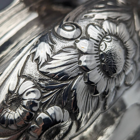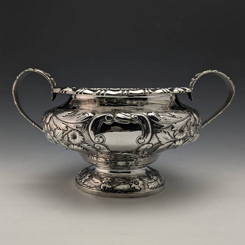 全体に大ぶりの花の浮彫彫刻で装飾された美しいシュガーボウルです。