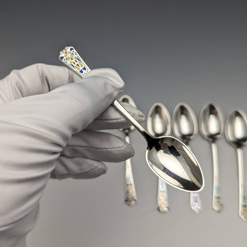 1930年代 英国ヴィンテージ 純銀製 エナメル装飾 ティースプーン6本セット