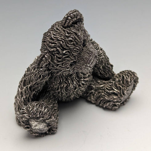 小首をかしげたテディベアのぬいぐるみのスターリングシルバー彫刻のオブジェです。