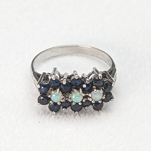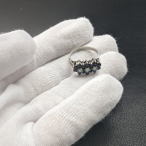 英国ヴィンテージジュエリー ダークブルーストーン&オパール3連フラワー シルバーリング(8-9号) 指輪