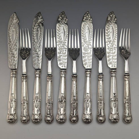 純銀製のハンドルとシルバープレートのブレードのフィッシュカトラリー5ペアセットとなります。