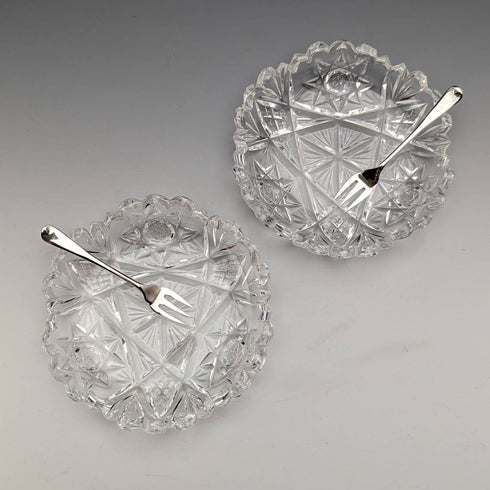 美しい手彫りのカットガラス製のボウルと純銀のフォークのペアとなっています。
