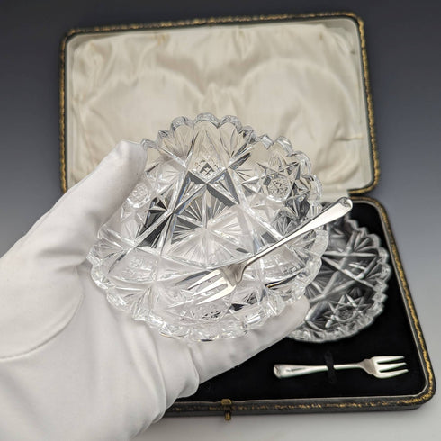 1927年 英国ヴィンテージ カットグラス ディッシュペア 純銀フォークセット CW Fletcher & Sons 箱入り