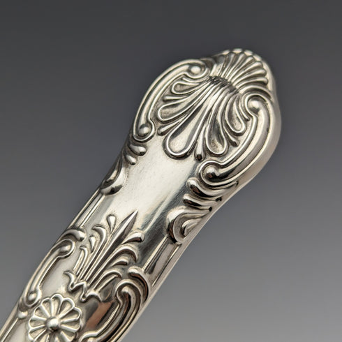 純銀製のハンドルには伝統的なクイーンズパターンが施されています。
