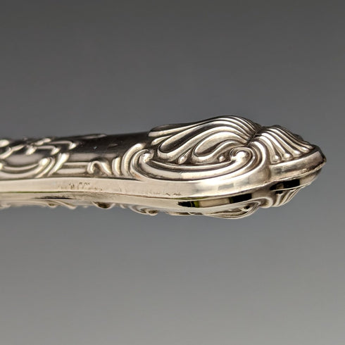 純銀製のハンドルには伝統的なクイーンズパターンが施されています。