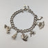 反戦や馬車など6個ほどのシルバー製のチャームがチェーンに取り付けられたブレスレットです。