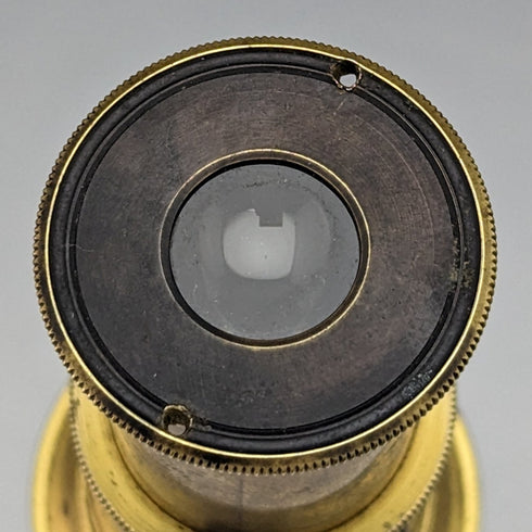 国やメーカーは不明ですが、真鍮製の古い小型の顕微鏡です。