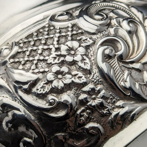 全体に小花やスクロールの細密な浮き彫り装飾がほどこされています。