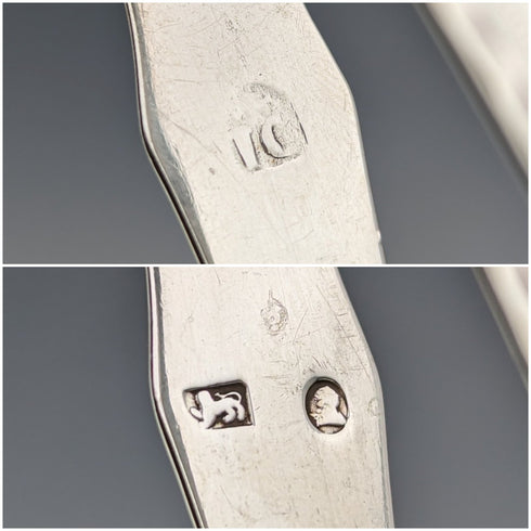 英国試金鑑定所による純銀を保証するホールマークが残っていますが、地域を示すアセイオフィスと製造年を示すデイトレターが見当たりません。