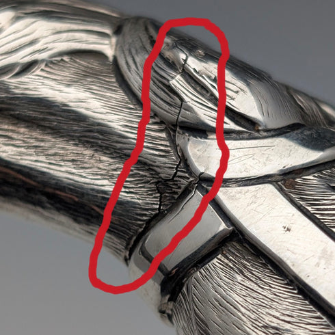 見事な彫刻のハンドルで、側部に亀裂が見られるものの彫刻に紛れて目立ちませんし強度的な問題はなさそうです。