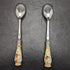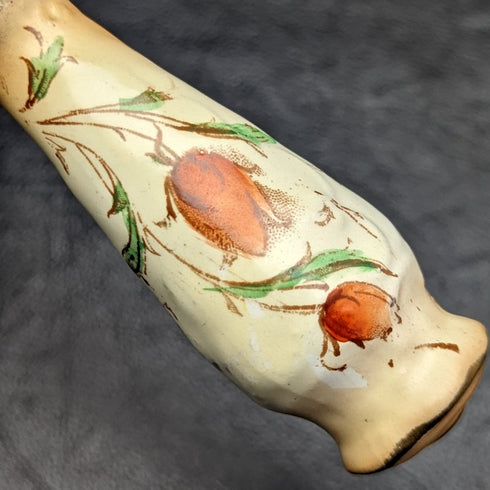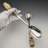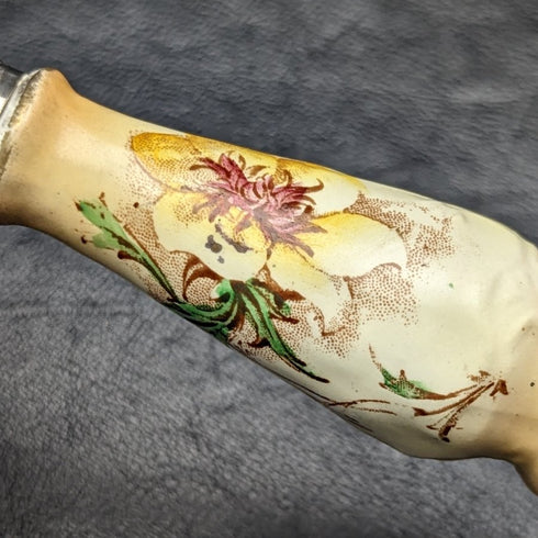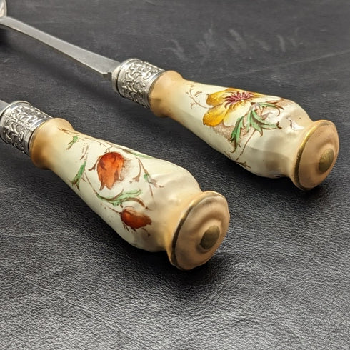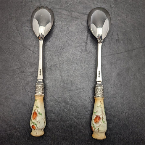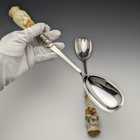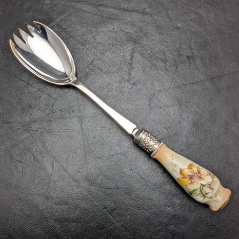 Salad server set with unusual ceramic handle and silver plate bowl.