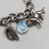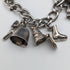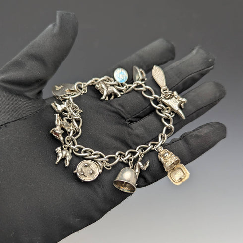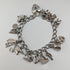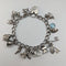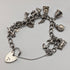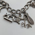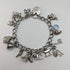 A bracelet with about 14 silver charms of various shapes attached to a chain.