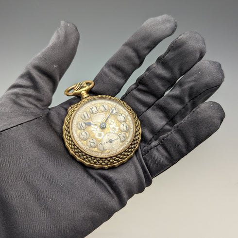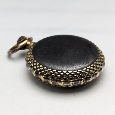This is a gold-plated and gunmetal case pocket watch believed to be from around 1890.