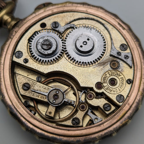 Circa 1890 Antique Pountet Chavet Pocket Watch with Gold Filling and Gunmetal Case in Good Working Condition
