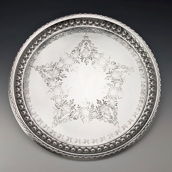 介紹英國古董托盤。英國古董「International Silver Co」的銀鍍層托盤。直徑約36cm的大型圓形,無腳款式盤面裝飾有以花為主題的美麗圖案。希望這次的「一期一會」成為您特別的邂逅!【狀況】外觀:★★★★☆ 無明顯刮痕或污漬的美品 功能:★★★★☆ 有輕微老化但幾乎無問題・雖有歲月磨損,但鍍層未剝落,狀態美麗・背面有製造商的銀鍍層刻印 ※因為是古董品,會有歲月留下的細微刮痕及污漬。 ※請確認照片並同意後再行購買。【詳細】・製造商 International Silver Co.・製造年份 不明(古董)・材質 銀鍍層・尺寸 直徑365 x 高度20mm・重量 761g※因為是古董品,完全相同的商品不會有第二件※如有不明之處,歡迎隨時提問。
